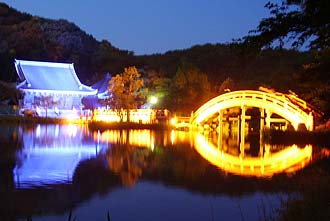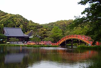 京浜急行金沢文庫駅近くの称名寺で本堂と庭園の池に架かる橋のライトアップを見て来た。