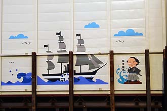 龍馬さんが立っている所から運河を見ると巨大な壁が視界を塞いでいて、その壁には可愛らしいタッチの龍馬さんと黒船が描かれていた。