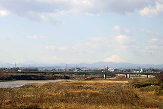 関越自動車道走行中に車窓から見た富士山。